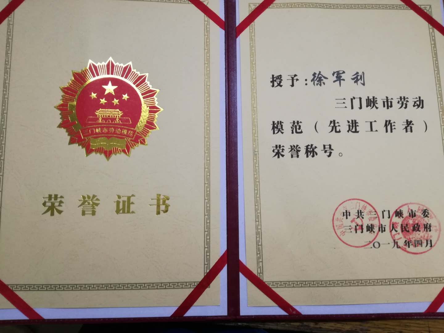 熱烈祝賀昊博公司徐軍利同志獲得“三門(mén)峽市勞動(dòng)模范”榮譽(yù)稱(chēng)號(hào)