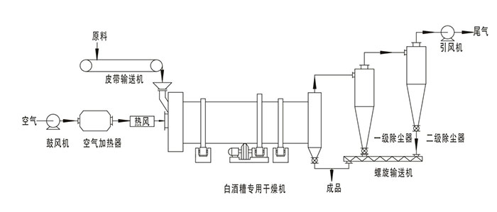 白酒糟烘干機(jī)主要由熱源、上料機(jī)、烘干滾筒、傳動(dòng)裝置等構(gòu)成,濕酒糟送入烘干滾筒,筒體內(nèi)設(shè)有多個(gè)排列為螺旋形的抄板,通過(guò)簡(jiǎn)體的旋轉(zhuǎn)帶動(dòng)抄板將酒糟不停的揚(yáng)起,筒壁的擊打裝置防止物料粘結(jié)筒壁及抄板,揚(yáng)起的物料與由引風(fēng)系統(tǒng) 傳入的熱氣流充分接觸,加快了烘干傳熱、傳質(zhì),蒸發(fā)水分,完成干燥,由出料口排出。酒糟烘干機(jī)可快速將水分含量在 65%左右的濕酒糟經(jīng)過(guò)脫水、烘干至水分含量在10%左右的干品,用于制做高蛋白飼料,實(shí)現(xiàn)了酒糟烘干處理的機(jī)械化、工 業(yè)化、自動(dòng)化。設(shè)備機(jī)械化程度高,生產(chǎn)能力大,可連續(xù)運(yùn)轉(zhuǎn),操作方便,故障少,維護(hù)費(fèi)用低,功耗低。